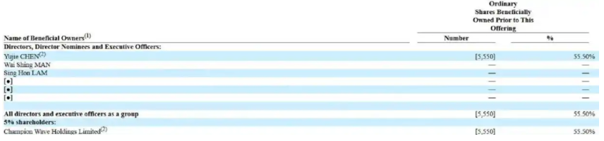 IPO前,Yujie CHEN持股55.5%,Tak Wai, CHU持股20%。