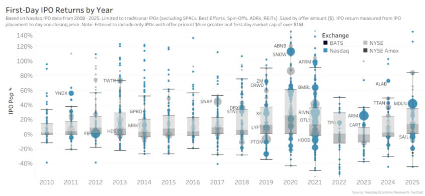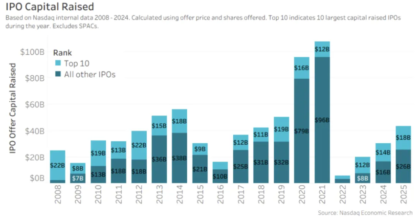 其中,81%的新IPO企业选择纳斯达克作为上市平台,这些企业在IPO当天共筹集了250亿美元资金。