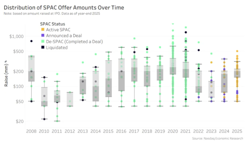 2025年,许多SPAC筹集的资本超过了前三年。中位数SPAC筹集资金达2亿美元,2021年略低于2.2亿美元,大致与2016 - 2020年持平。