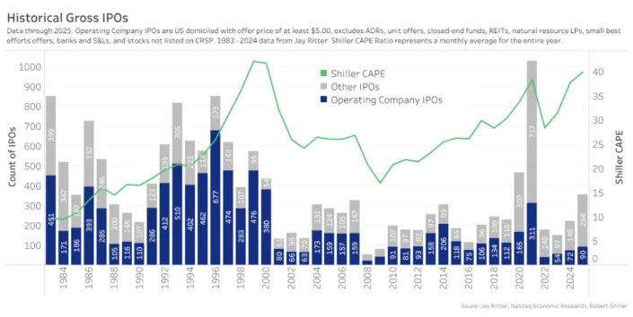 2025年,美国股票市场共迎来了354次IPO,相较于2024年增加了136次,比2023年更是多出206次。不过,这一数字与2021年的巅峰水平相比仍有较大差距。值得注意的是,运营公司的IPO数量仍未恢复到2010年代后半期的规模。