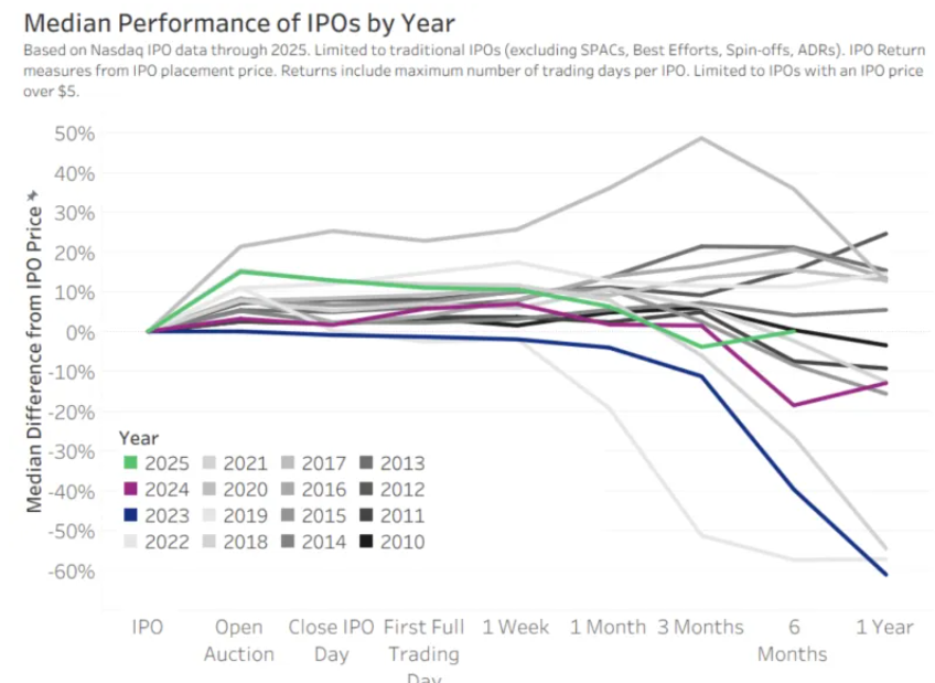 不过,我们也观察到,随着IPO上市时间的延长,其“热度”逐渐消退。尽管2025年IPO的中位数表现有所下滑,但从长期来看,其中位数回报优于2024年和2023年的IPO表现。值得一提的是,6个月平均回报率为36%,位居第二,但这一数据排除了6月之后的IPO,因为这些IPO尚未足够成熟。