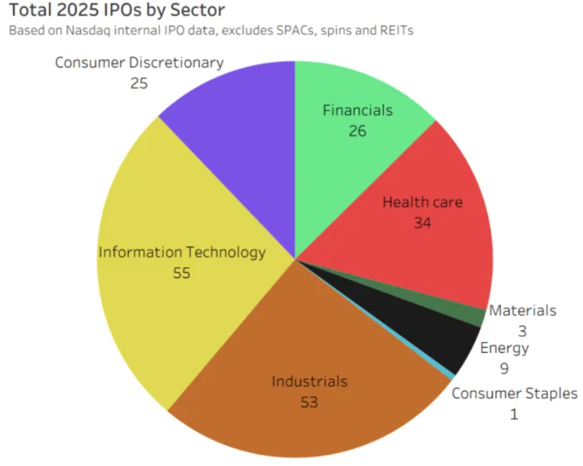 从资本需求角度来看,各行业差异明显。MDLN和CRWV是两大IPO巨头,首日市值分别达到540亿美元和186亿美元(尽管实际筹集资金仅为市值的一小部分)。医疗保健行业紧随其后,34家公司IPO共筹集106亿美元。工业行业虽已有53次IPO,但仅筹集50亿美元,显示出工业公司对资本的需求约为医疗保健公司的一半。