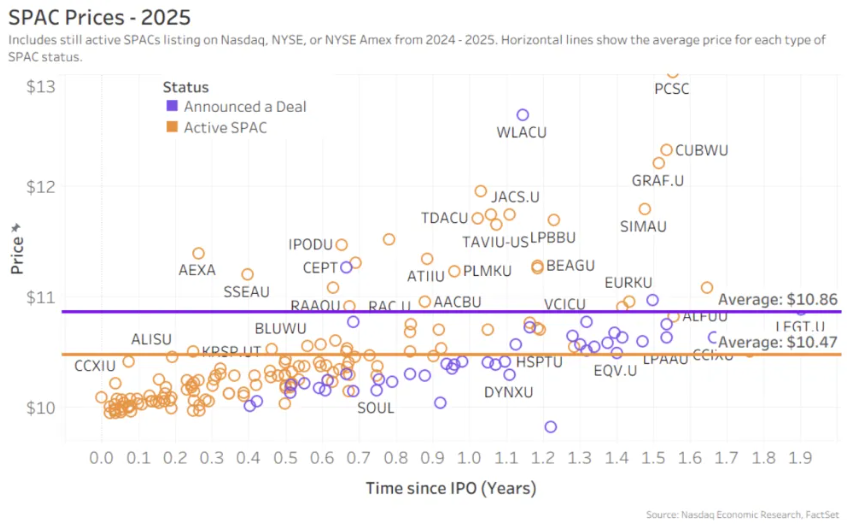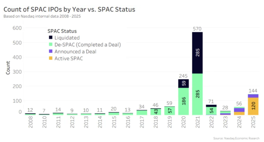 目前,2025年上市的SPAC中有120家仍在积极寻找目标企业(橙色),24个已宣布达成协议(紫色)。通常,SPAC有大约两年时间达成协议,不过可通过股东批准延长存续期(一般可再延长一年),之后若未达成协议则必须清算。回顾过往几代SPAC的情况:2024年所有SPAC仍在运作,截至年底,8个完成交易(绿色),26个已宣布,22个仍在运作;2023年仅有两个SPAC仍在运作,两个已清算(黑色);2021年上市高峰年度的SPAC中,已有50%被清算。