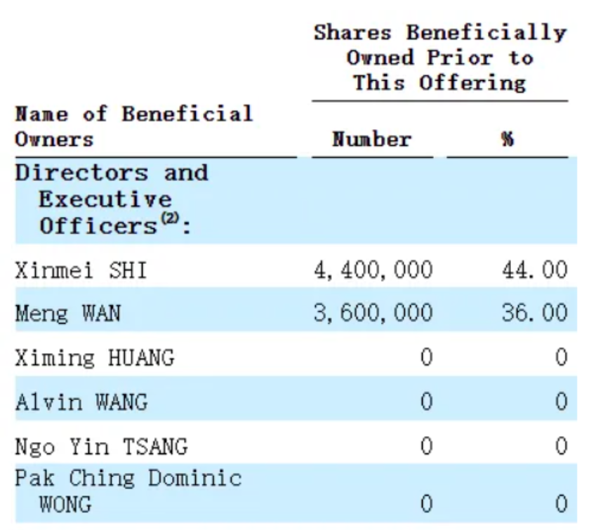 IPO前,Xinmei SHI持股44%,Meng WAN持股36%。