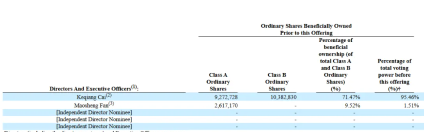 主要股东IPO前,蔡克强持有71.47%的B类股,拥有95.46%的投票权。Maosheng Fan和Ke Wu共同持有9.52%的A类股,拥有1.51%的投票权。