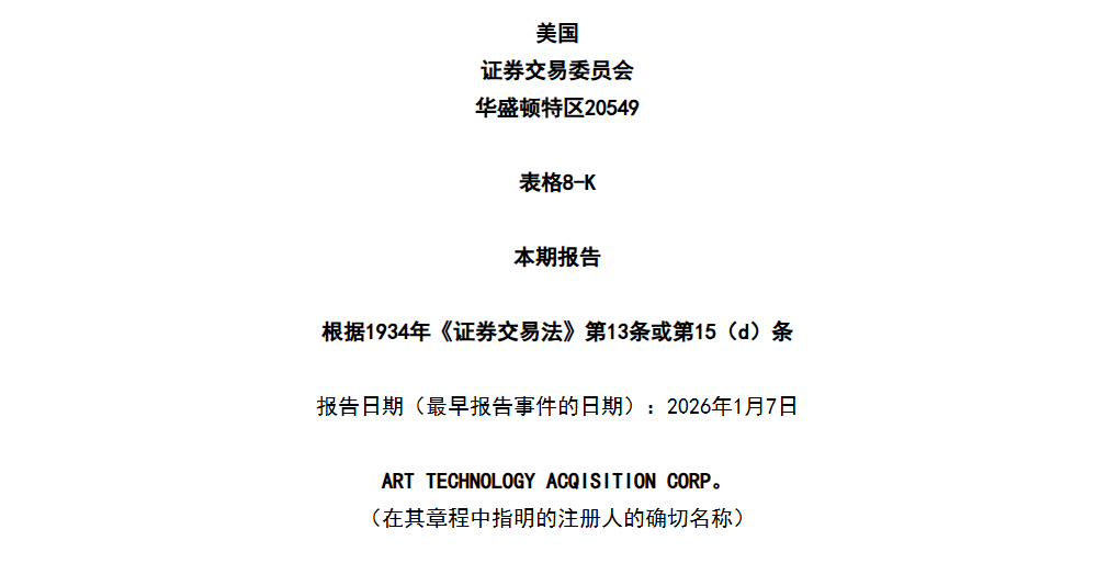 2026年1月14日,特殊目的收购公司(SPAC)Art Technology Acquisition Corp.(股票代码:ARTCU)正式登陆纳斯达克,完成挂牌交易。本次上市募资2.2亿美元,专项用于后续跨界领域标的并购,成为2026年美股SPAC市场的新增力量。